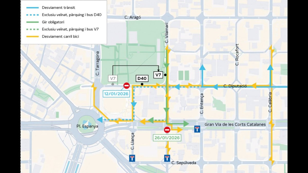 Como consecuencia de ello, el tráfico se desviará por las calles Entença y Calàbria hacia Aragó hasta Tarragona para poder llegar a plaza España, y los vecinos y vehículos de emergencia podrán acceder hasta la calle Llança.