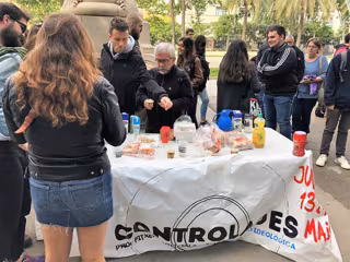 A las puertas de la Audiencia de Barcelona, una treintena de militantes y simpatizantes de Arran y la CUP se han concentrado para protestar por este juicio, realizando un desayuno popular; entre ellos, los diputados de la CUP en el Parlament Maria Sirvent y Vidal Aragonés.