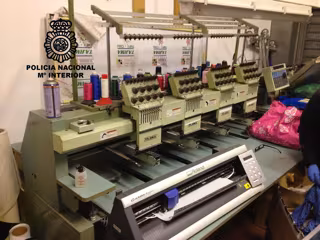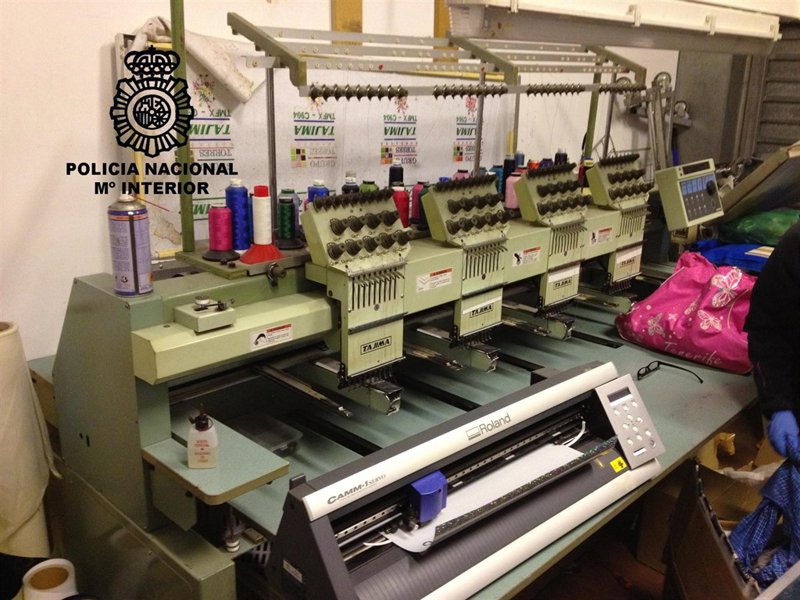 El taller había sido montado en un garaje de grandes dimensiones, habilitándose adecuadamente para alojar una máquina industrial para bordar, prensas de calor para adherir 'transfers' y marcos de serigrafía para imprimir con pintura los logos de las marcas falsificadas.