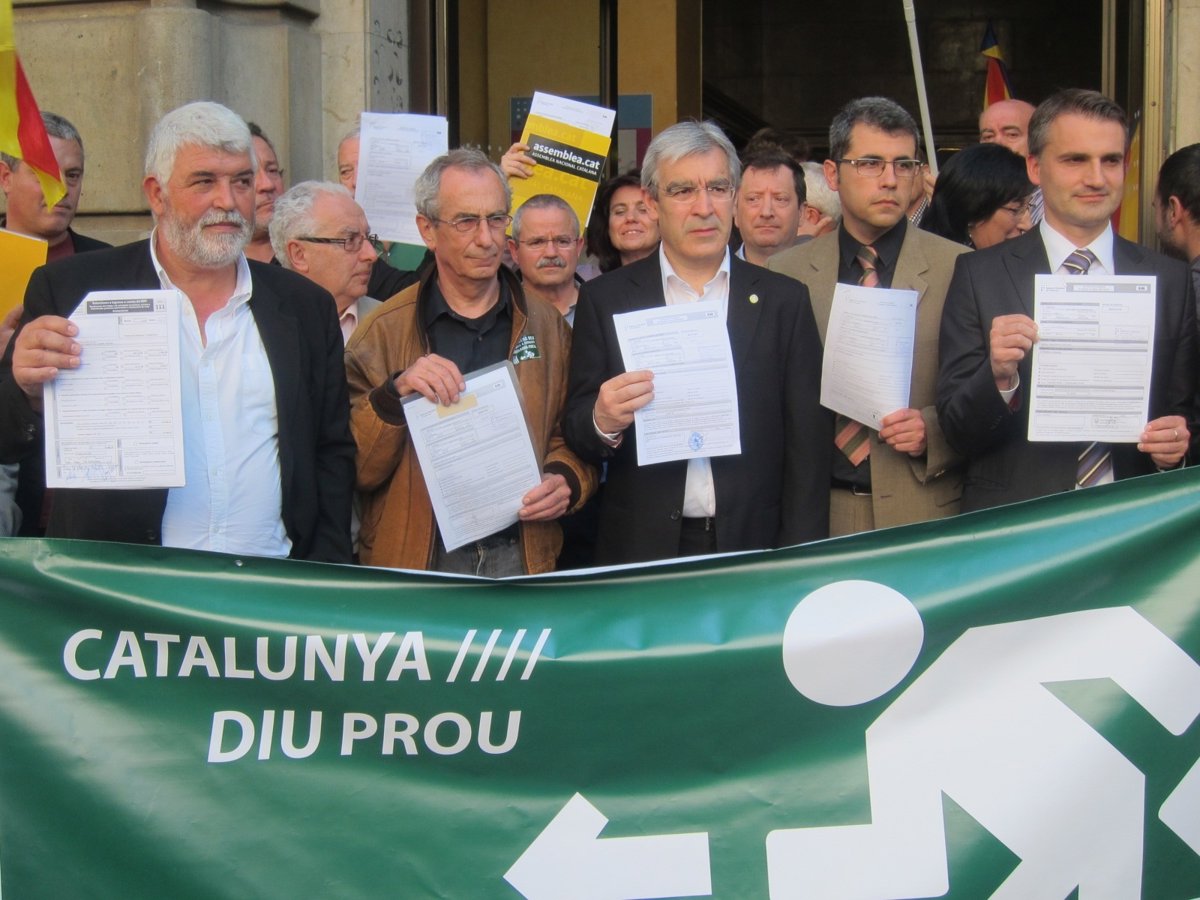Los once ayuntamientos han formalizado el pago de sus impuestos en las respectivas delegaciones de la agencia tributaria catalana en Barcelona, Girona y Tarragona, y en la capital catalana los alcaldes han estado acompañados por una treintena de independentistas y miembros de la plataforma 'Catalunya diu Prou' --'Catalunya dice basta' en castellano--.
