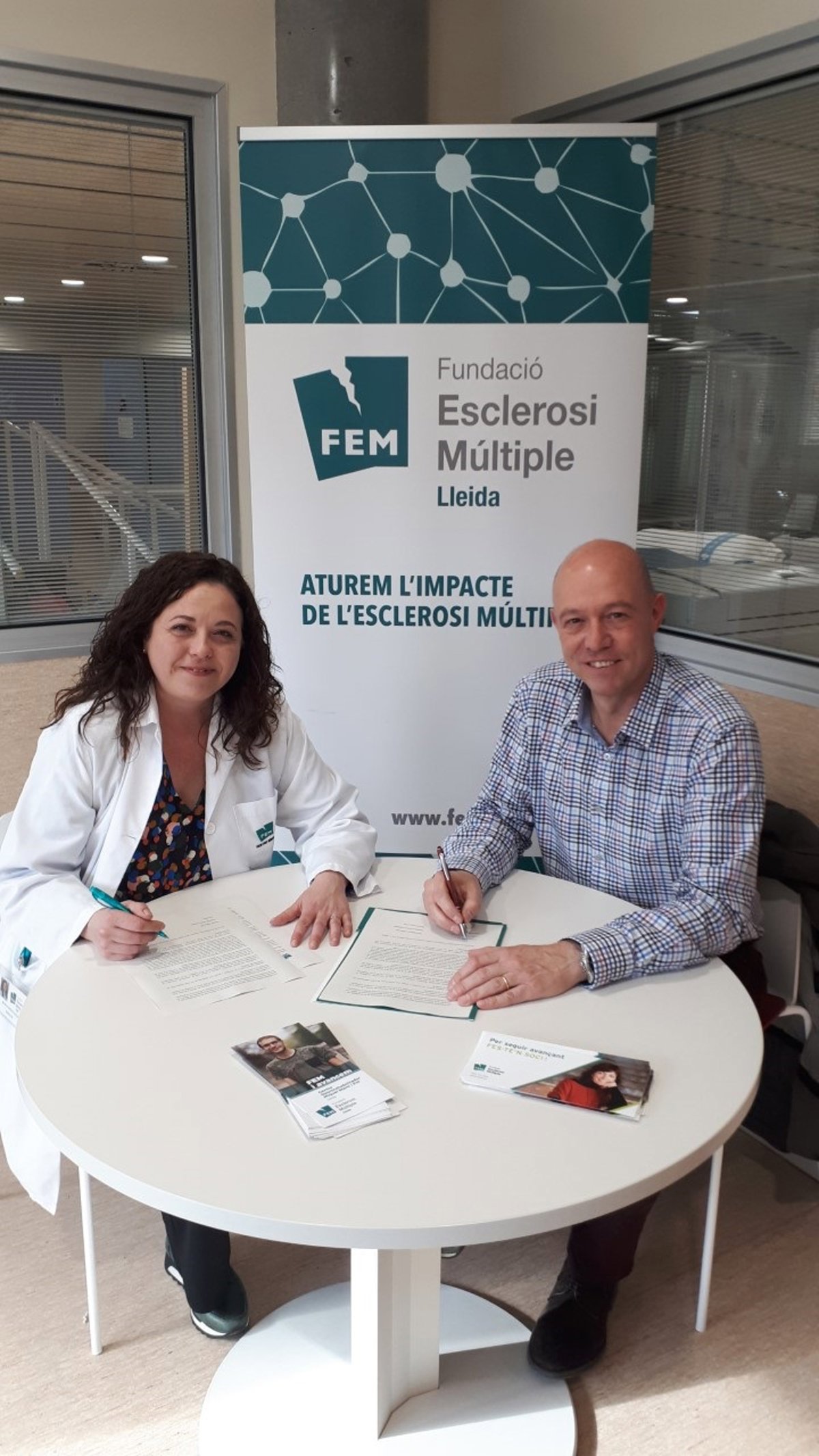 La directora de la Fundació Esclerosi Múltiple de Lleida, Mnica Nieves Collado, y el presidente de la Fundació Orfeó Lleidat, Antoni Soliva, han firmado un convenio por el cual las personas con esclerosis múltiple participarán en un programa de musicoterapia innovador en el Centre Neurorehabilitador M. Martí i Pol.
