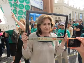 La portavoz de la PAH, Ada Colau, en declaraciones a los periodistas, ha explicado que con esta acción en la que todos los participantes llevaban un marco de cartón simulando una pantalla de plasma en alusión a las ruedas de prensa del presidente, ha informado de que se trata de la "clausura a la campaña de escraches realizada durante la tramitación de la Iniciativa Legislativa Popular (ILP)".
