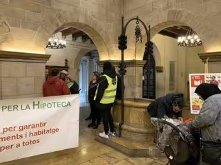 Miembros de la Plataforma de Afectados por la Hipoteca (PAH) han ocupado desde las 9.00 a las 14.30 horas de este viernes el vestíbulo del Ayuntamiento de Lleida para protestar por el desalojo de 29 personas de un bloque propiedad de la Sareb en la calle Ripolls, en el barrio de Balafia.