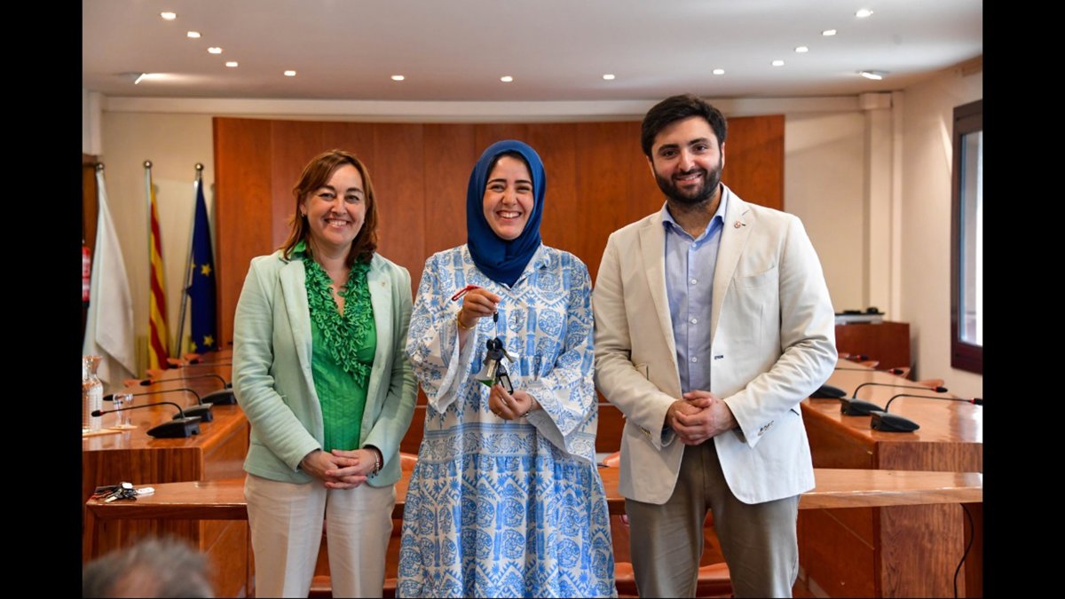 La consellera de Territorio de la Generalitat, Sílvia Paneque, ha entregado este viernes las llaves de los pisos adjudicados de una promoción de seis viviendas de alquiler de protección oficial en Manlleu (Barcelona).