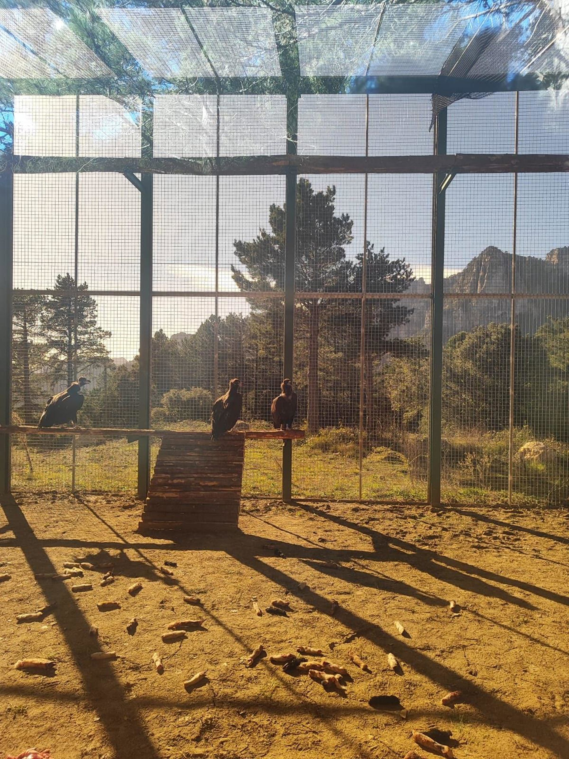 Los buitres se han instalado en la jaula de aclimatación que el parque construyó en 2023 con fondos Next Generation y permanecerán en estas instalaciones entre 6 y 10 meses con el objetivo de que puedan asociar el territorio con la disponibilidad de alimento y con la presencia de congéneres.