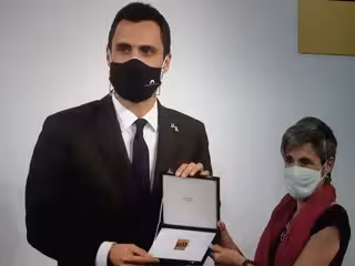 Ha recogido el galardón la doctora del Hospital de Igualada Dolors Arnau, en representación todos los profesionales y sectores que componen el sistema sanitario, en un acto al que han asistido el presidente de la Generalitat, Quim Torra; el del Parlament, Roger Torrent; el vicepresidente Pere Aragons; la consellera de Salud, Alba Vergés, y los diferentes líderes de los grupos parlamentarios de la cámara catalana.