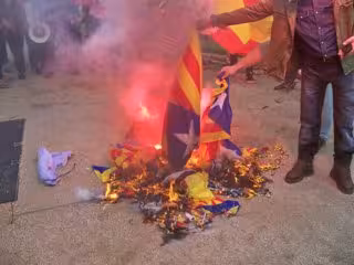 Participantes de la concentración convocada por la extrema derecha este miércoles en Barcelona han quemado varias banderas independentistas catalanas en la plaza Sant Jordi de la montaña de Montjuïc para mostrar su rechazo a la independencia de Catalunya.