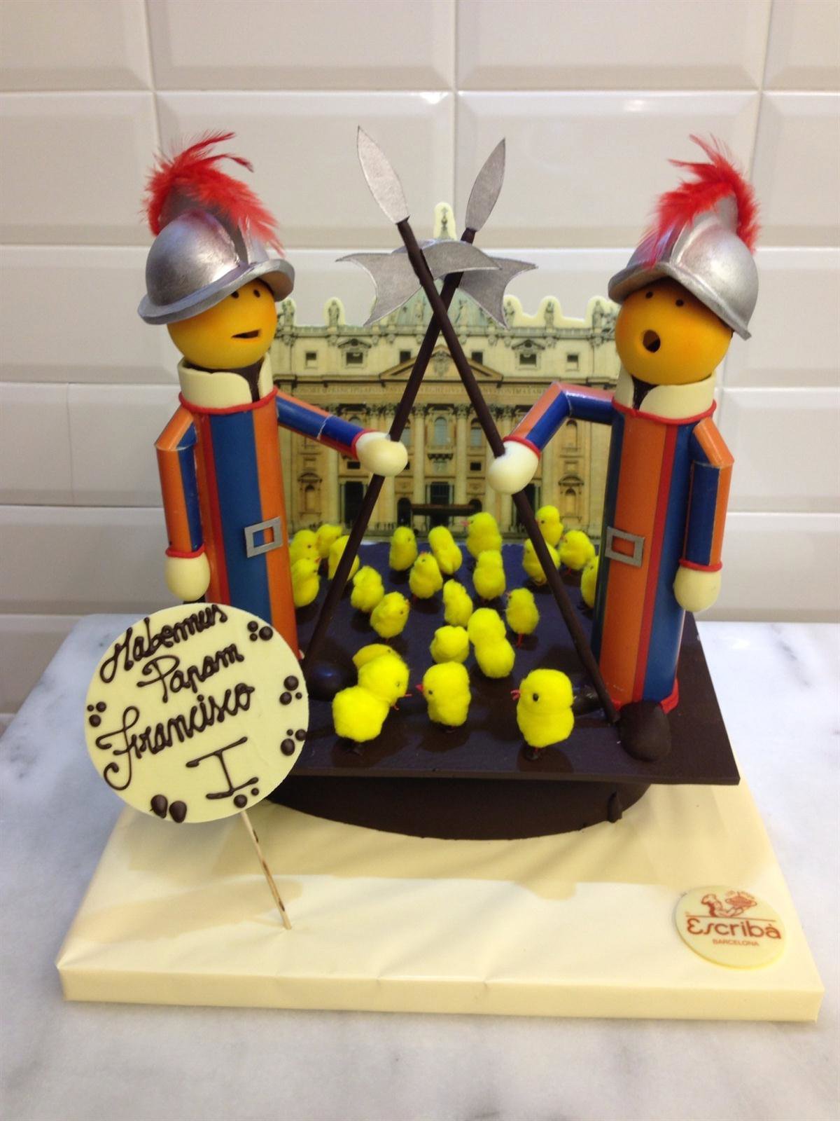 El dulce representa el Vaticano custodiado por dos miembros de la Guardia Suiza, con los fieles a las puertas del templo y una medalla de chocolate con la leyenda 'Habemus Papam. Francisco I'.