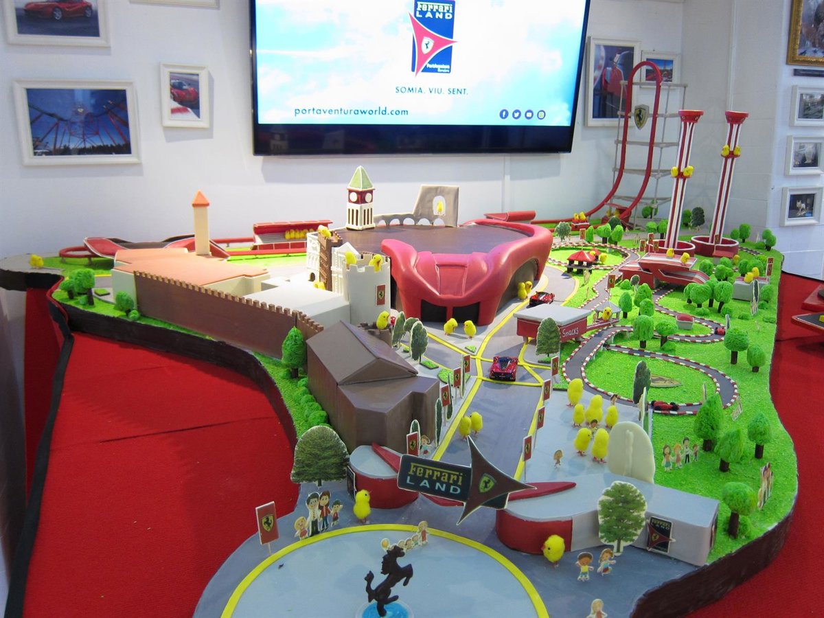 La pastelería barcelonesa Escribà ha reproducido en mona de Pascua una maqueta del nuevo parque temático Ferrari Land de PortAventura World en Vila-seca/Salou (Tarragona), que ha presentado este lunes y en la que ha utilizado 50 kilos de chocolate y cinco kilos de pasta de azúcar de diferentes colores.