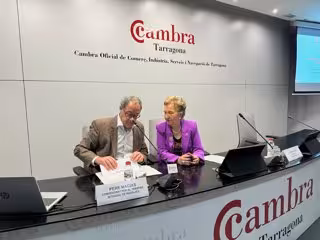 El comisionado para el traspaso integral de Rodalies, Pere Macias, junto a la presidenta de la Cámara de Tarragona, Laura Roigé, este martes en unas jornadas en el ente cameral - CÁMARA DE TARRAGONA