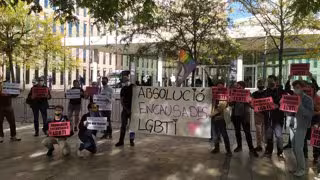 Concentración de la Crida LGBTI antes del juicio a cuatro manifestantes del Orgullo en 2019 por hacer pintadas a un autobús de Cs en Barcelona. El 13 de octubre de 2020. - EUROPA PRESS