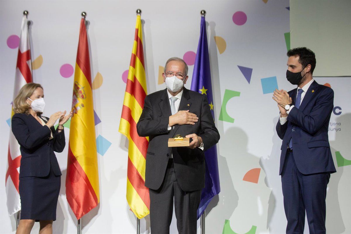 El expresidente de Pimec, Josep González, en el momento de recibir el galardón de manos de la vicepresidenta primera del Gobierno, Nadia Calvió, y del Conseller de Empresa y Trabajo de la Generalitat, Roger Torrent. - DAVID ZORRAKINO - EUROPA PRESS