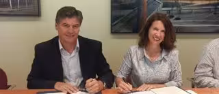 El secretario general de Pimec, Antoni Cañete, y la presidenta de la Universidad americana de Shenandoah, Tracy Fitzsimmons, han firmado un convenio de colaboración por el que el centro educativo, ubicado en Virginia, se convertirá en una plataforma de aterrizaje de las pymes catalanas en los Estados Unidos.