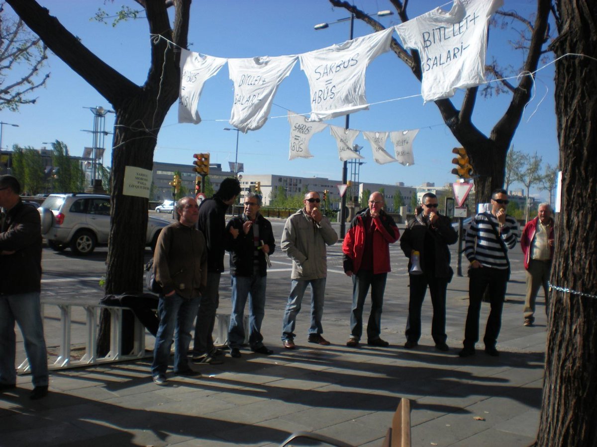 Unos 40 trabajadores de Autobusos de Lleida, empresa gestionada por Sarbus, se han concentrado ante las oficinas de la compañía, en la avenida de Madrid, para preparar la huelga de tres días convocada por la plantilla