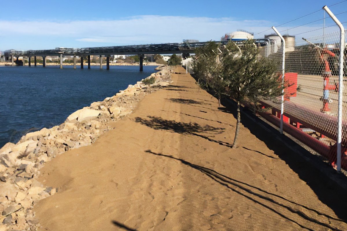 La plataforma está ubicada en una franja de terreno entre el rompeolas y el cierre perimetral y cuenta con un ancho de dos metros y una longitud de 210 metros.