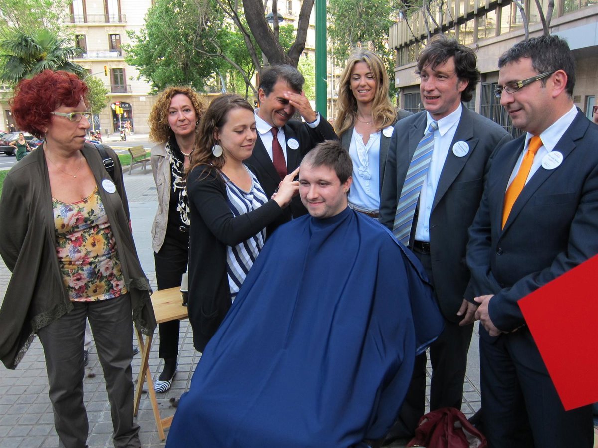 Para simbolizar lo que considera una tomadura de pelo del Gobierno a la ciudad, Portabella ha hecho estas declaraciones mientras a su lado una peluquera rapaba prácticamente al cero a un militante de las JERC, las juventudes del partido.