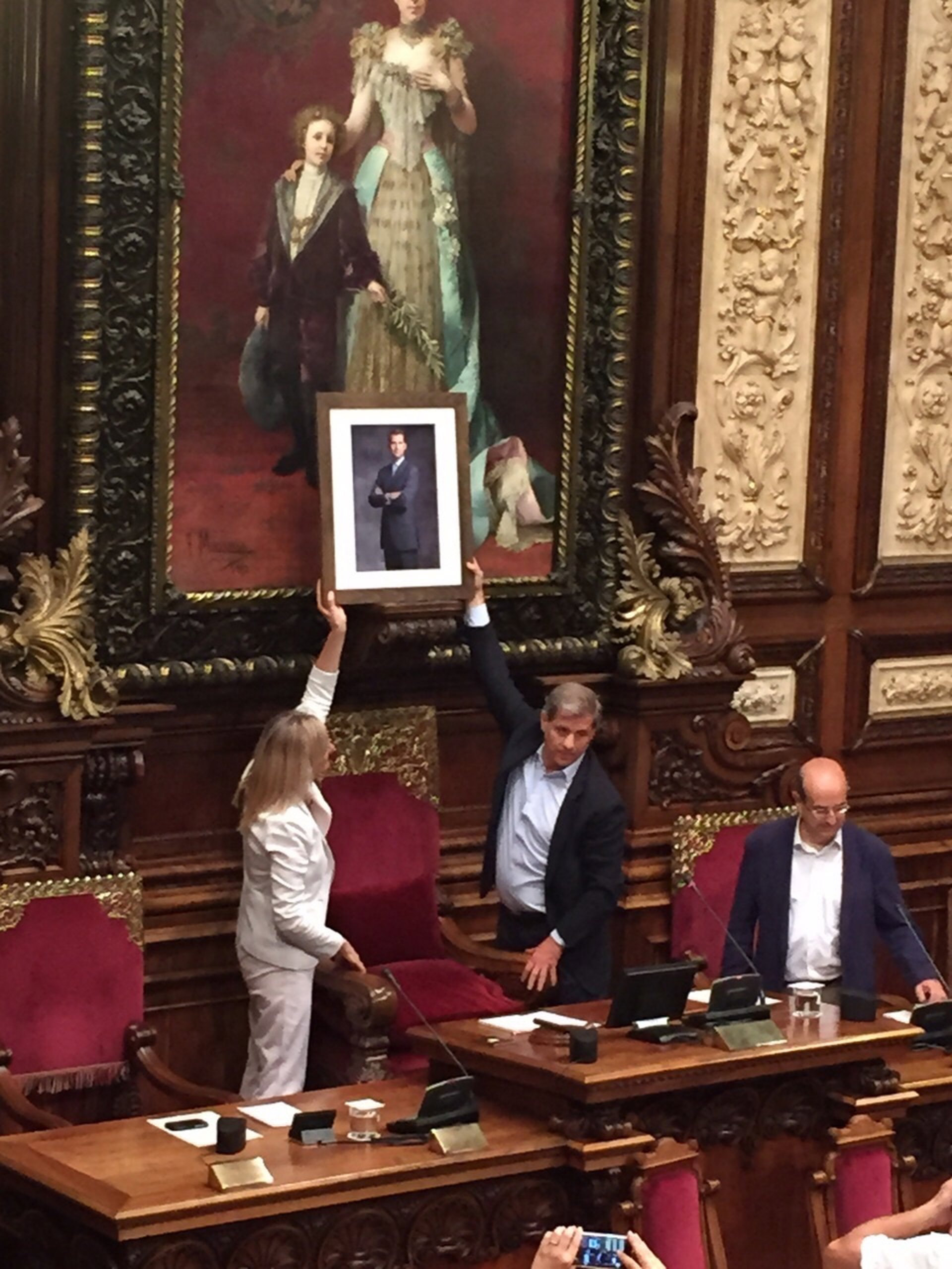 El presidente del grupo municipal del PP de Barcelona, Alberto Fernández, y la concejal Àngels Esteller han colgado este viernes una foto de Felipe VI en el lugar donde estaba el busto de Juan Carlos I del salón de plenos del Ayuntamiento, y el primer teniente de alcalde de BComú, Gerardo Pisarello, lo ha retirado posteriormente.