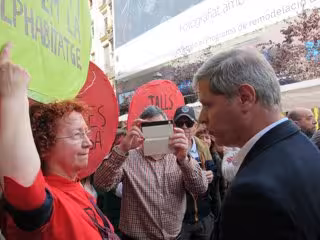 Fernández ha presentado sus prioridades en materia de civismo en la encrucijada de La Rambla con la calle Hospital, donde ha visitado la tradicional feria de Sant Ponç, y ha sido seguido en todo momento por los representantes de la PAH de una forma pacífica.