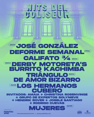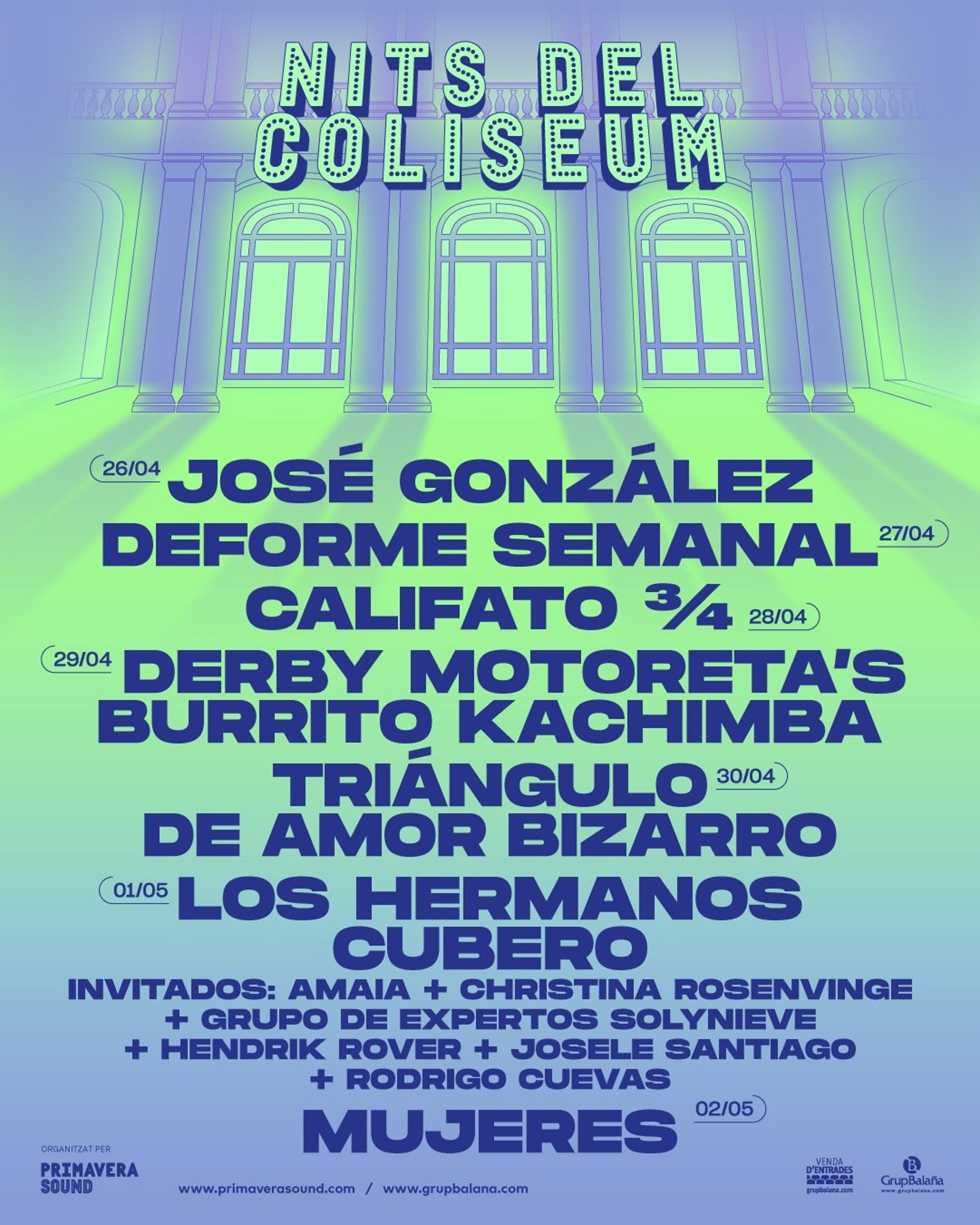 En el ciclo Nits del Coliseum, le seguirán Deforme semanal, con un show de variedades el 27 de abril; Califato, con la presentación del disco 'La contraeña' el 28 de abril.