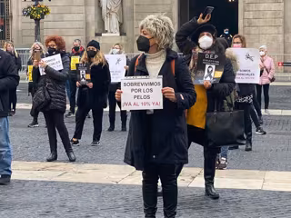 Así, profesionales del sector se han manifestado en una concentración organizada por las plataformas 'Creer en nosotros' y Plataforma de Peluqueros Unidos de España, llevando pancartas con mensajes como 'Sobrevivimos por los pelos, ¡IVA al 10% ya!' y clamando 'Somos esenciales, 10% ya'.