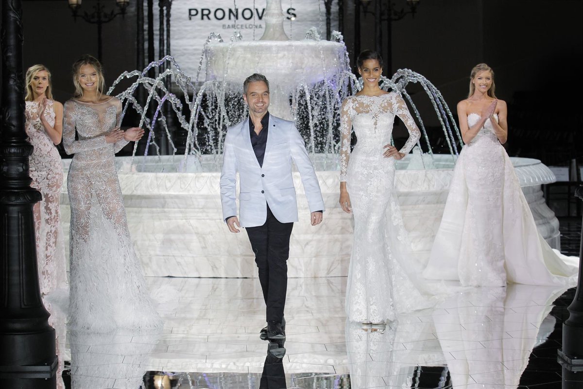 Para la próxima temporada, Pronovias propone vestidos con cortes sirena y evasé, así como grandes volúmenes, trabajados con organza, crepé, raso mórbido, encajes franceses y bordados de pedrería blanca.