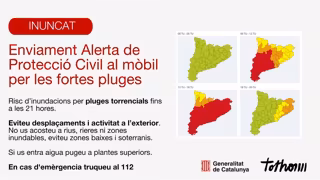 Protecció Civil de la Generalitat ha enviado sobre las 14.30 de este sábado un mensaje de alerta por el empeoramiento de las previsiones y el riesgo de inundaciones a los móviles de Catalunya, excepto en las comarcas que quedan fuera de la alerta: Val d'Aran, Alta Ribargorça, Alt Urgell, Cerdanya, Pallars Jussà y Pallars Sobirà (Lleida).