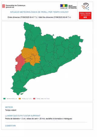 Por otro lado, el Servei Meteorològic de Catalunya ha informado en 'X' que este aviso por tiempo violento es hasta las 08.40 horas de este miércoles; que hay posibilidad de ráfagas descendentes o tornados y que el grado de peligro es "máximo".