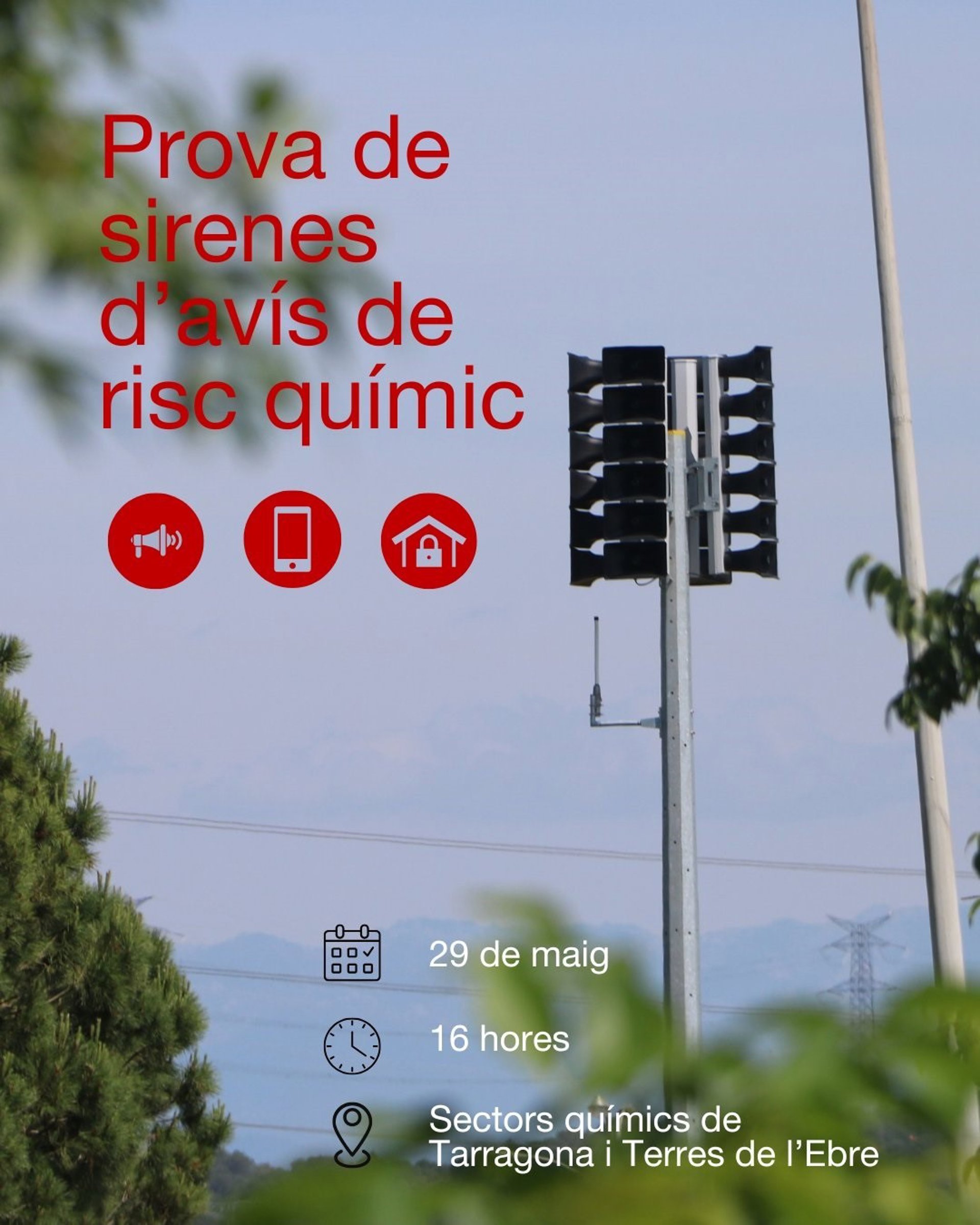 El ejercicio está previsto para las 16 horas y se hará en 14 municipios donde hay sirenas instaladas: 12 del sector químico de Tarragona (Plaseqta) y dos del Plan especial de emergencia exterior del sector químico en Catalunya (Plaseqcat) en Flix y Tortosa.