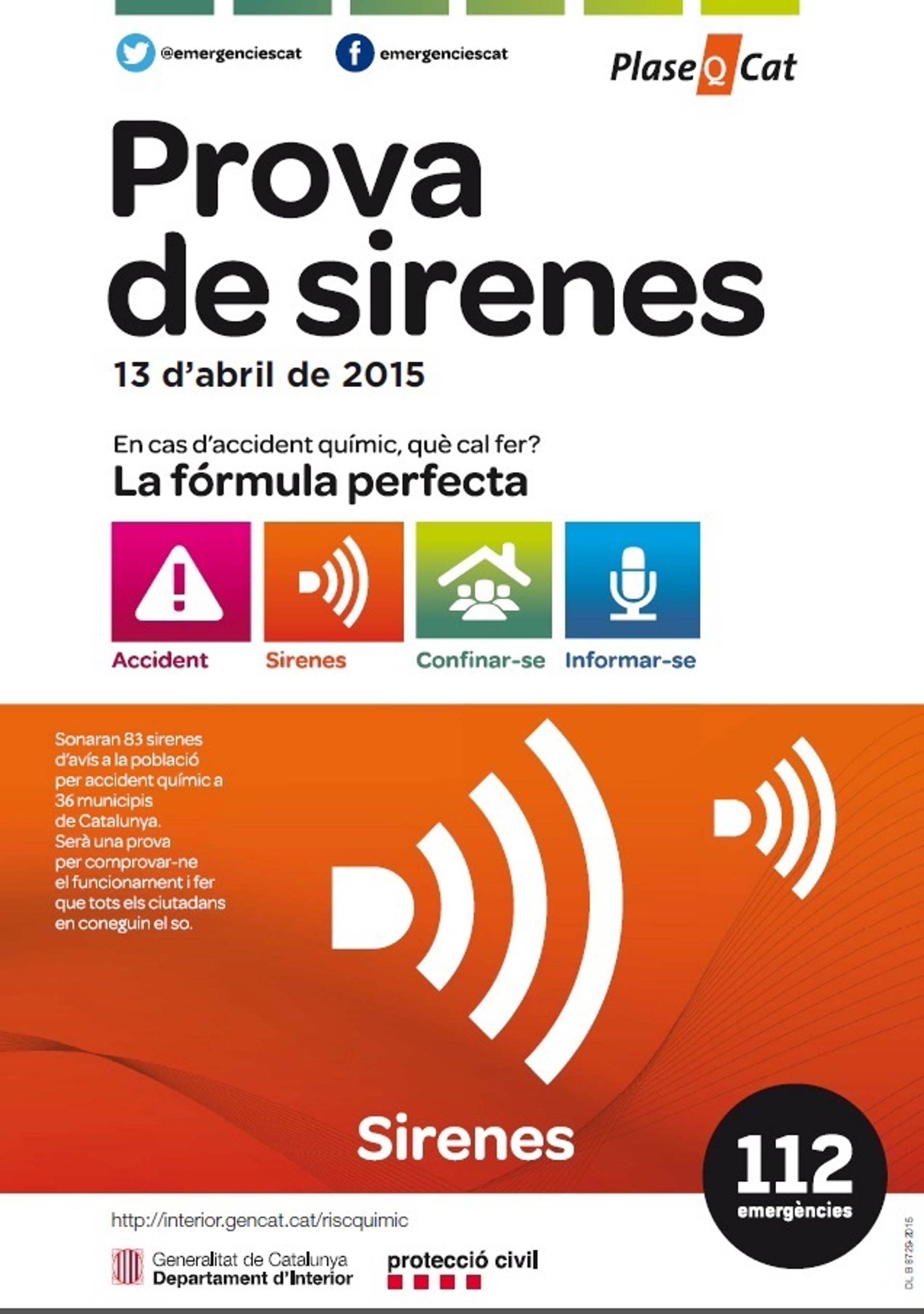 La Dirección General de Protección Civil de la Generalitat realizará un simulacro el próximo lunes a partir de las 10.00 horas en 37 municipios para probar las sirenas que sirven para alertar de un accidente químico.