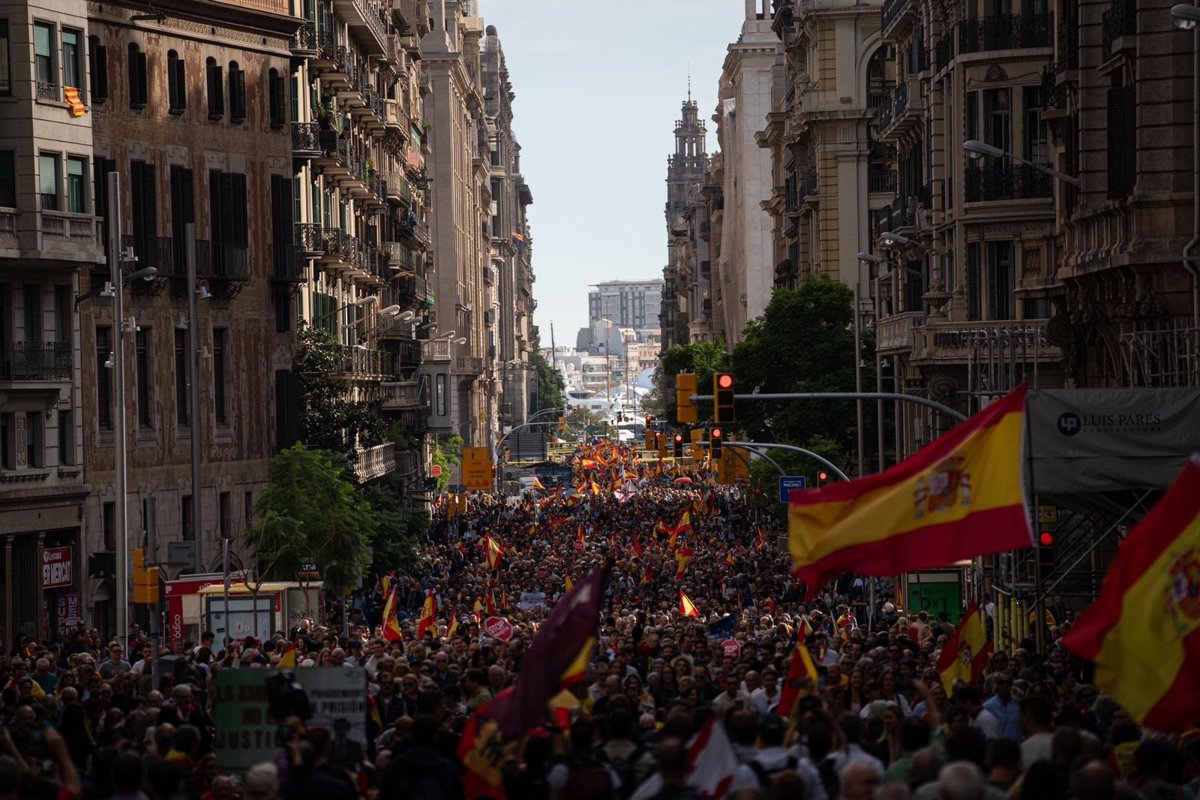 Los participantes de la concentración convocada para este domingo en la plaza Sant Jaume de Barcelona contra la amnistía ha llenado después sobre las 13.00 la Via Laietana, en dirección a la Delegación del Gobierno en Catalunya.