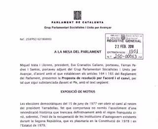 La iniciativa socialista incluye una extensa exposición de motivos que critica la aprobación el 6 y 7 de septiembre de 2017 de la ley de transitoriedad jurídica y la del referéndum, que aspiraban a "liquidar las instituciones de autogobierno catalanas".
