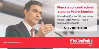 'Ven a la concentración en apoyo a Pedro Sánchez. El viernes 30 de septiembre, a las 24 horas, nos vamos en autocar hacia Madrid. Llama a la asociación y apúntate', reza el cartel que la agrupación socialista en Terrassa está difundiendo en las redes.