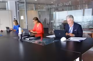 La directora de Comunicación del Puerto de Barcelona, Núria Burguera; la responsable de Relaciones Internacionales, Mnica Fornells, y el jefe de Relaciones Externas, Manuel Galan, en la presentación del Port Summit Misión Empresarial Colombia 2020 - PUERTO DE BARCELONA