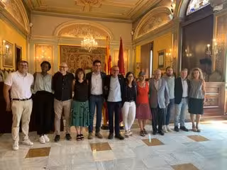 El alcalde de Lleida, Miquel Pueyo, junto a Toni Postius y Jordina Freixanet y el resto de concejales de ERC y JxCat. - EUROPA PRESS