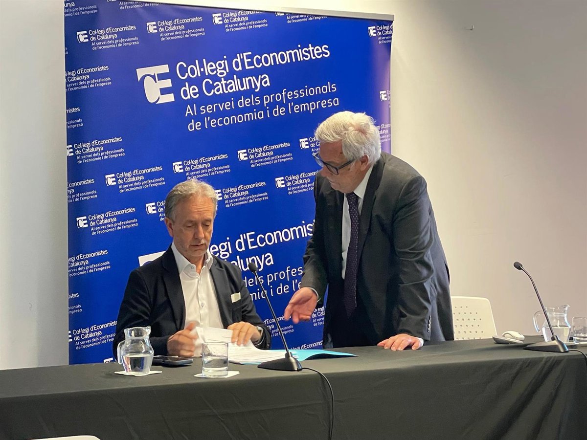 El decano del Col·legi d'Economistes de Catalunya (CEC), Carles Puig de Travy, y el director técnico de la Encuesta de Situación Económica de Invierno 2026, Xavier Segura. - EUROPA PRESS