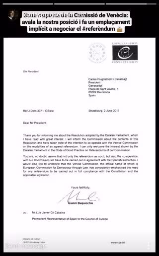 La respuesta de la Comisión, enviada el viernes por su presidente, Gianni Buquicchio, recuerda que tanto el referéndum como cualquier participación de este organismo en su celebración debe hacerse "de acuerdo con las autoridades españolas", algo que Puigdemont interpreta como un emplazamiento al Gobierno central para que negocie.