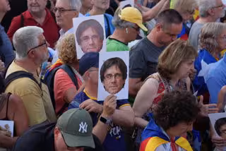 Puigdemont ha llegado al acto que el Consell de la República (CdRep) ha convocado en el Passeig Lluís Companys de Barcelona para recibirle de manera "institucional", donde miles de personas le esperaban con 'esteladas' y máscaras con la cara del expresidente.