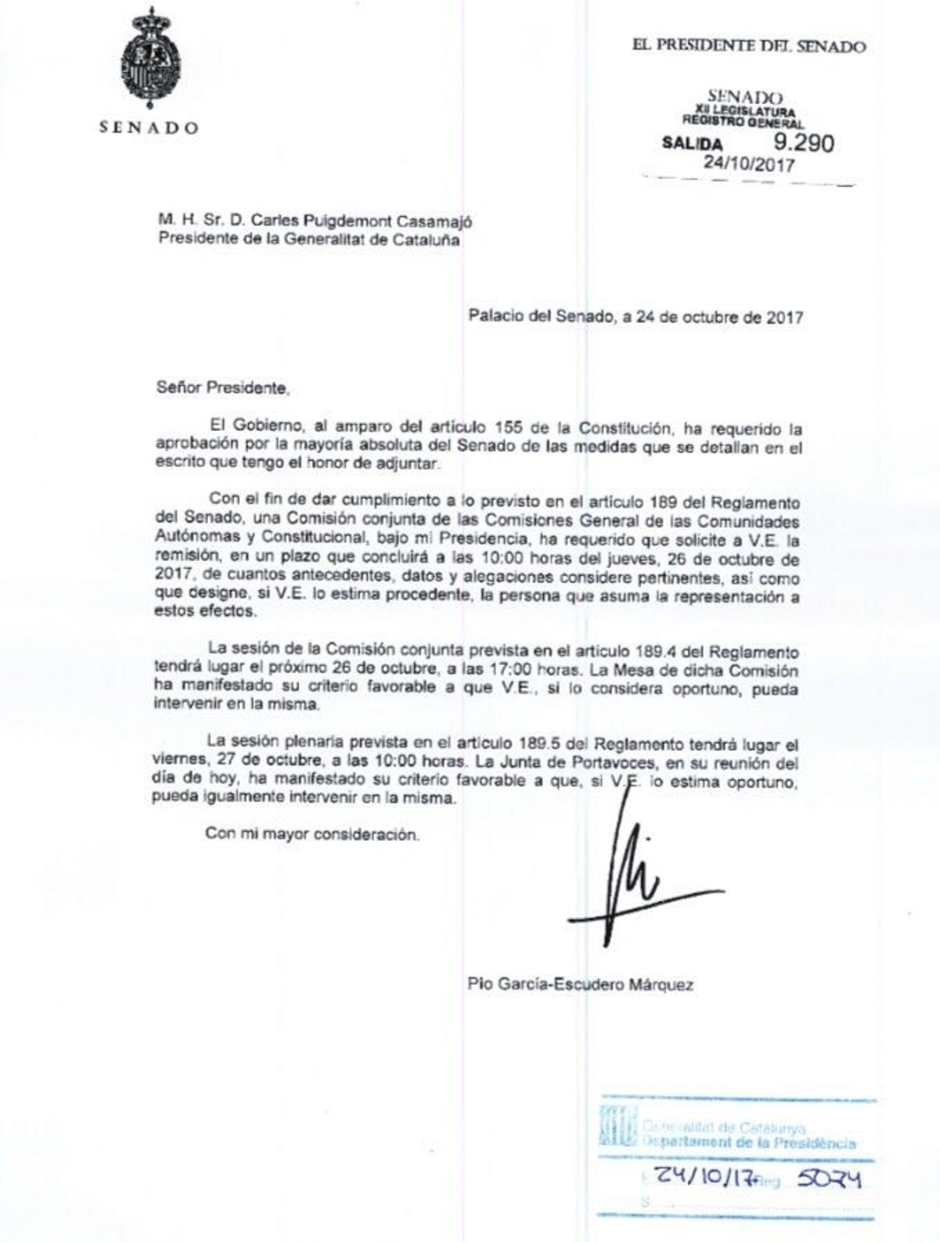 La carta ofrece a Puigdemont comparecer ante la Cámara Alta, si lo desea, y le ofrece hacerlo el jueves a las 17.00 en la Comisión que aborda la aplicación del 155, y también ante el pleno del Senado el viernes a partir de las 10.00.