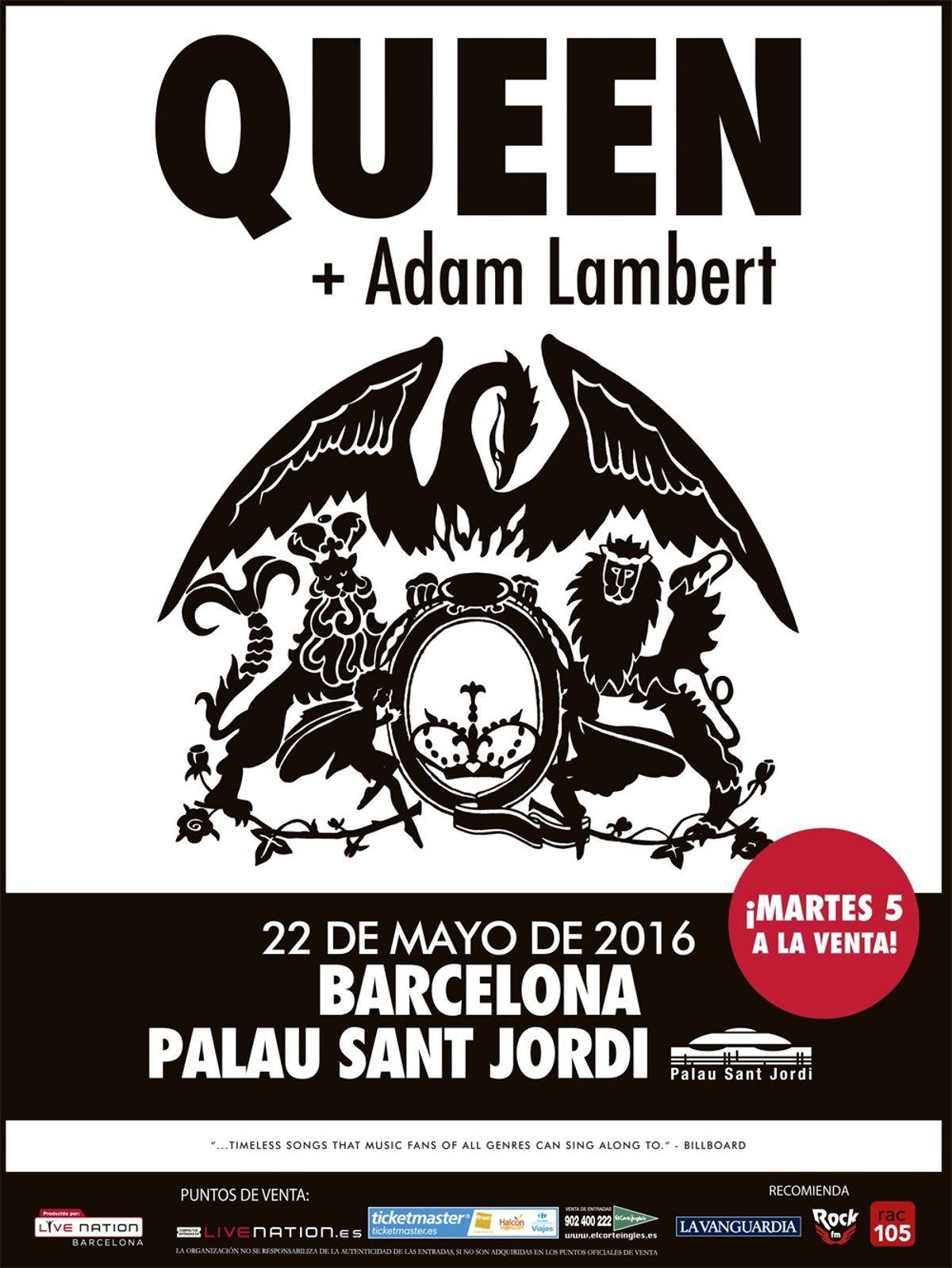 Los míticos Queen tocarán en el Palau Sant Jordi de Barcelona junto al cantante Adam Lambert el 22 de mayo de 2016, en el único concierto que recalará en España, ha anunciado la promotora Live Nation este jueves en un comunicado.