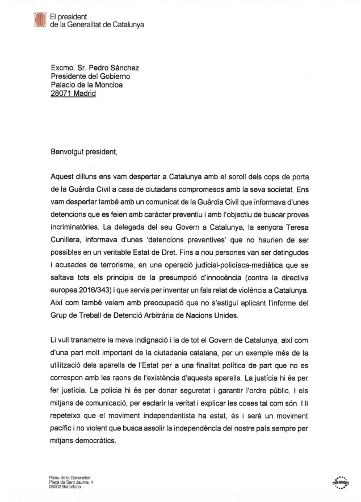 La carta del presidente de la Generalitat, Quim Torra, al presidente del Gobierno, Pedro Sánchez - GENERALITAT