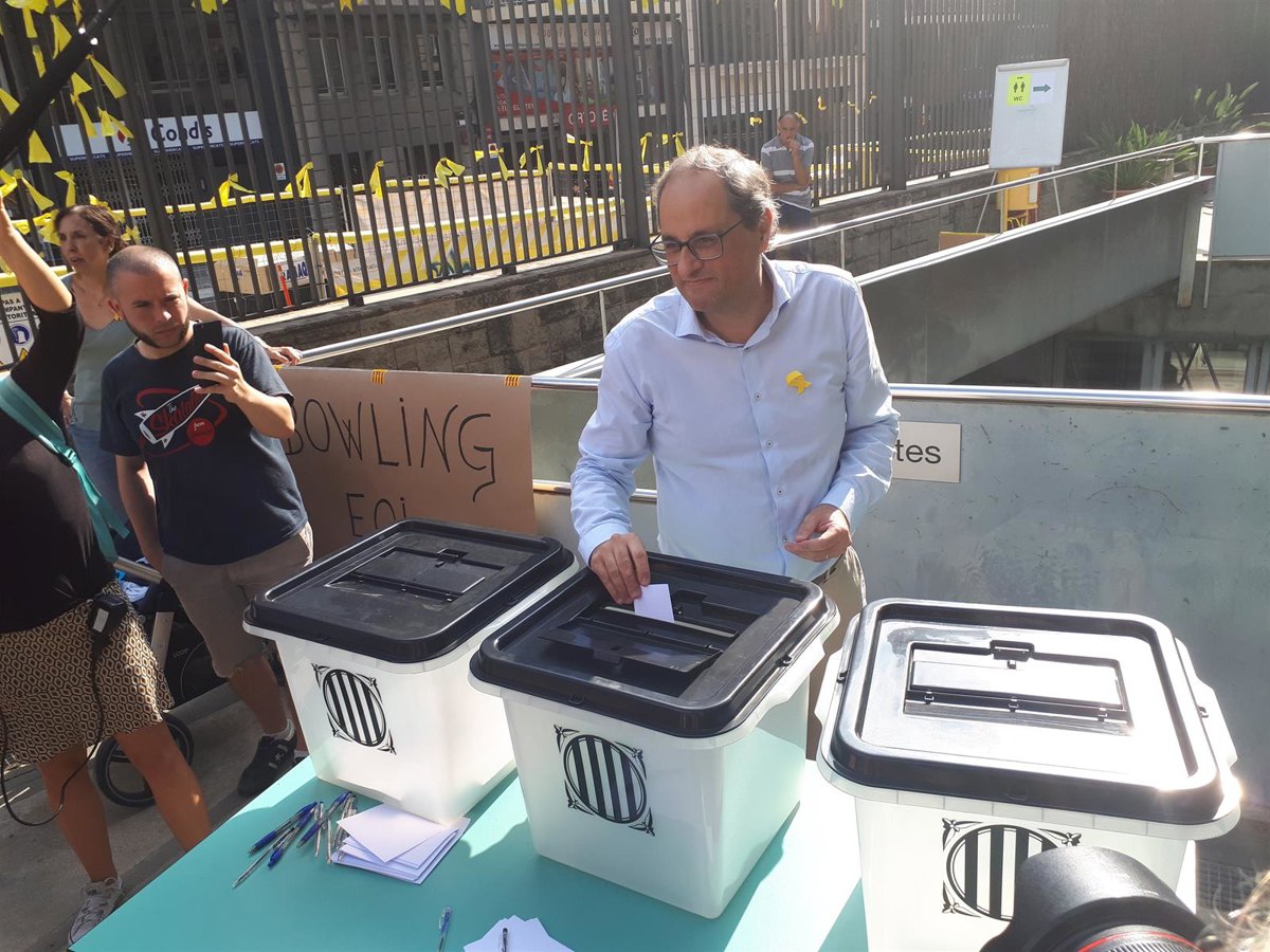 Torra ha llegado al colegio con su familia para visitar y participar en las actividades conmemorativas que han organizado los vecinos por el primer aniversario del 1-O, y que mantendrán hasta las 14 horas de este domingo.