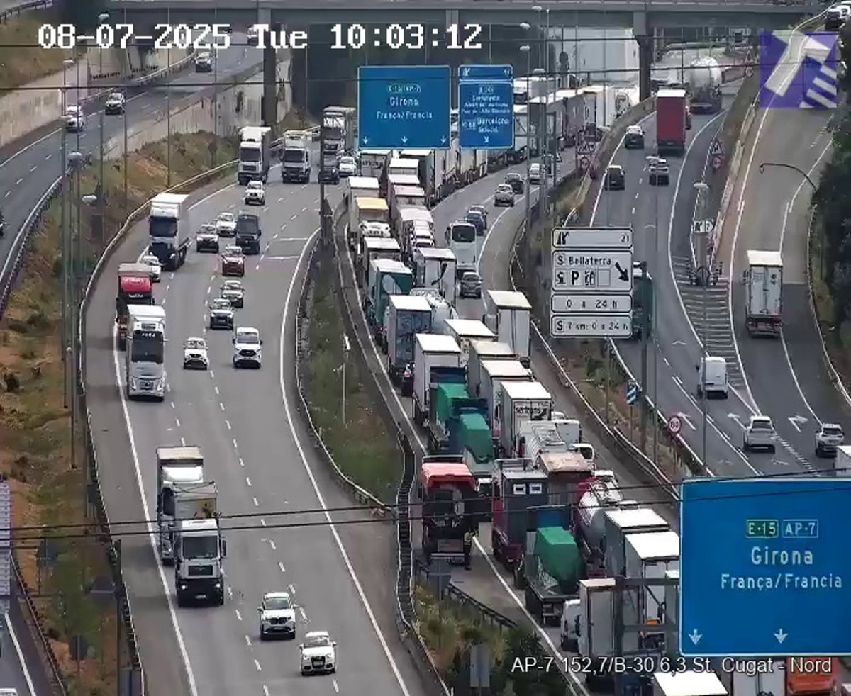 Imagen de la AP-7 en Cerdanyola (Barcelona) cuando tenía dos carriles cortados por el accidente de dos camiones. - SCT