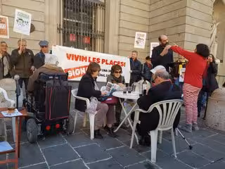 Entidades han empezado una campaña de recogida de firmas en Barcelona a favor de una Ordenanza de terrazas que garantice la accesibilidad, la movilidad y el descanso, que aseguran que están en riesgo con la actual propuesta de modificación, y lo han hecho instalando una terraza junto al Ayuntamiento, en la plaza Sant Jaume.