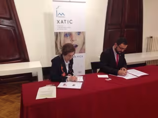 El director general de Juventud de la Conselleria de Bienestar Social y Familia de la Generalitat, Toni Reig, y la vicepresidenta de la Xatic y concejal de Turismo del Ayuntamiento de Terrassa, Teresa Casals, han firmado este jueves el convenio de colaboración en la sede de la Xatic, en Terrassa.