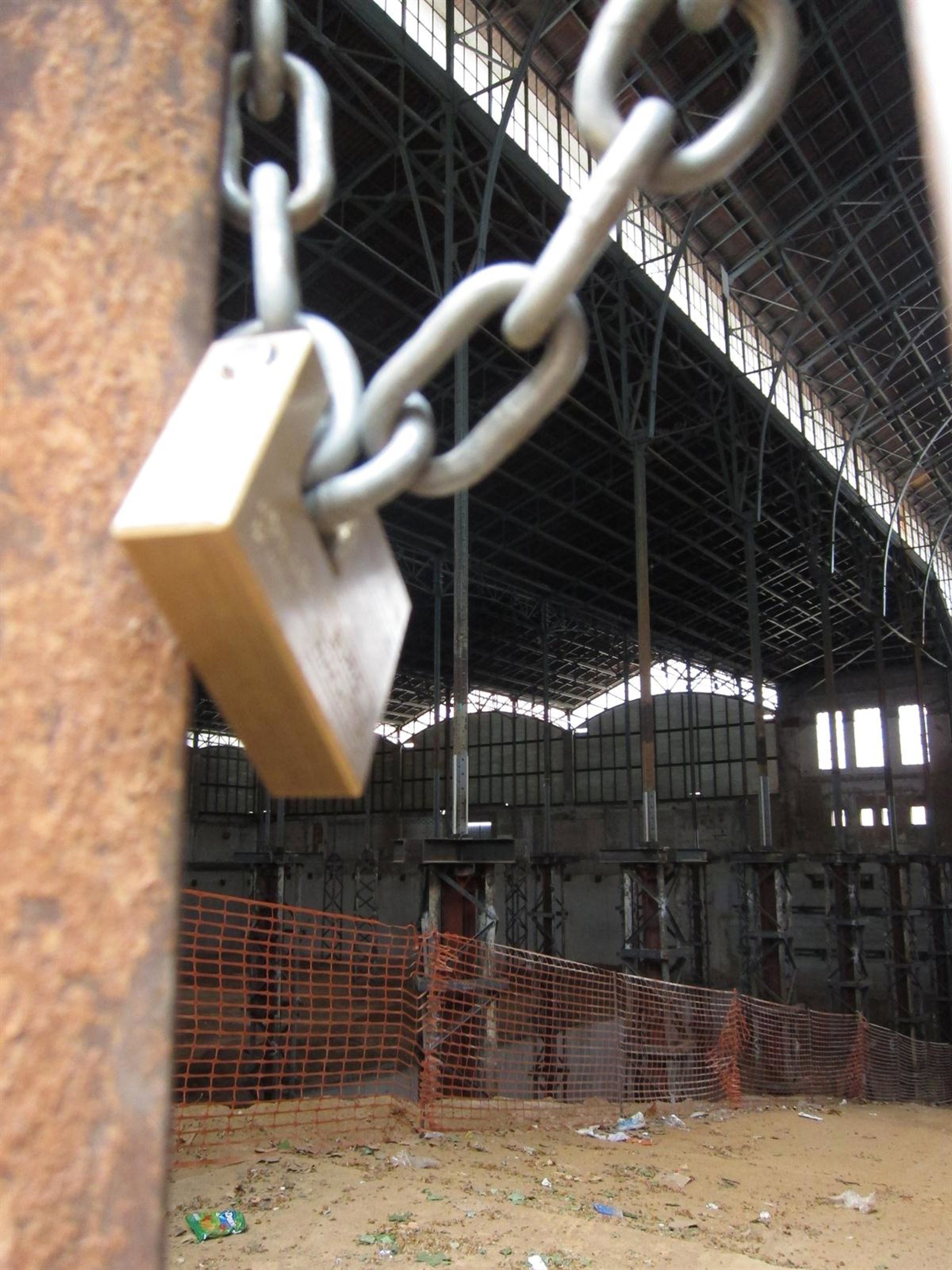 Los accesos exteriores del recinto a reformar están cerrados con candados, paneles explicativos sobre la evolución de las obras y vallas que lo rodeaban han sido retirados, y esta misma semana se han llevado módulos prefabricados que servían para los obreros.