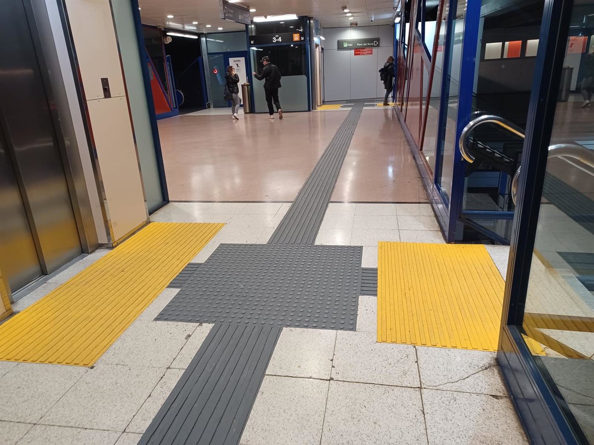Asimismo, se ha colocado pavimento de señalización en el embarque y desembarque de escaleras y ascensores, franjas de aproximación a los andenes con botones adheridos e indicaciones del borde del andén.