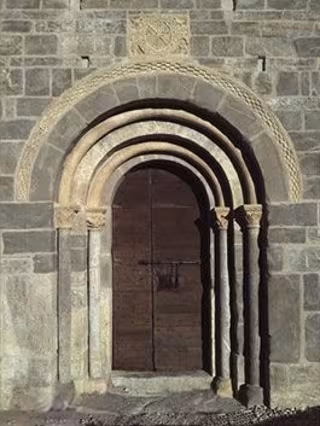 La portalada, construida en el siglo XII, está formada por una doble arquivolta de arco de medio punto, dos pares de columnas dispuestas a cada lado de la puerta con capiteles, en gradación y decorados con motivos vegetales, zoomorfo y humanos, y un friso estillado.