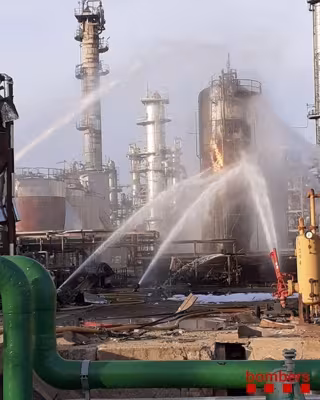 Imagen de las vías de agua de los bomberos para enfríar el tanque de óxido de propileno afectado en la empresa de La Canonja, Tarragona, el 15 de enero de 2020. - @BOMBERSCAT
