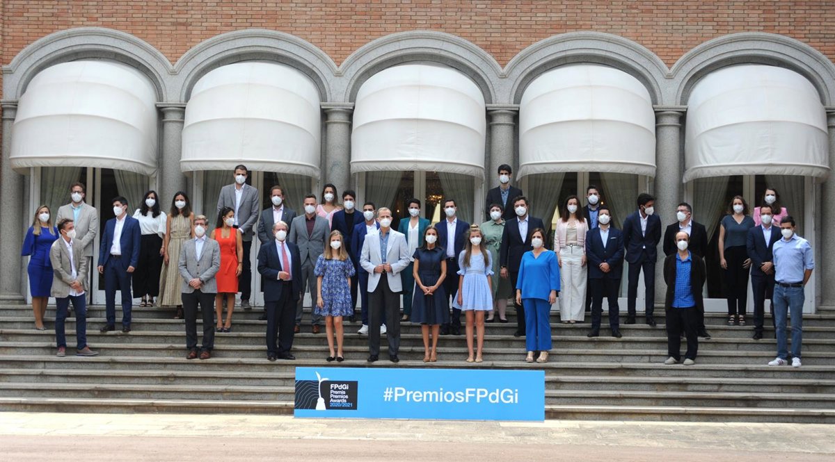 La Familia Real ha realizado un breve recorrido con la treintena de premiados y han realizado un posado en una de las escalinatas del palacete para la prensa gráfica, junto al presidente y la directora de la fundación, Francisco Belil y Mònica Margarit.