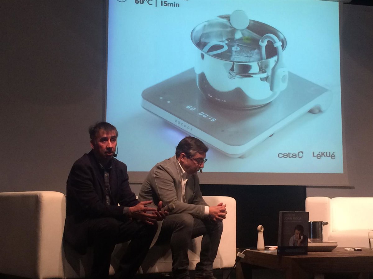 El restaurante El Celler de Can Roca ha lanzado este martes su proyecto Rocook para acercar la cocción a baja temperatura a los hogares, consistente en una especie de placa de inducción con termostato y el libro de recetas 'Cocina con Joan Roca a baja temperatura' (Planeta).